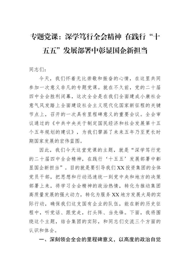 专题党课:深学笃行全会精神在践行“十五五”发展部署中彰显国企新担当同志们:今天,我们怀着无比崇敬和振奋的心情,在这里共同参加一次意义非凡的专题党课。就在不久前,党的二十届四中全会胜利闭幕,这次全会是在我们全面建成小康社会,意气风发踏上全面建设社会主义现代化国家新征程的关键节点上,召开的一次具有里程碑意义的重要会议。全会审议通过的《中共中央关于制定国民经济和社会发展第十五个五年规划的建议》,为我们擘画了未来五年乃至更长时期国家发展的宏伟蓝图。因此,我们今天这堂党课的主题,就是“深学笃行党的二十届四中全会精神,在践行‘十五五’发展部署中彰显国企新担当”。目的就是要引导我们XX投资集团的全体党员干部,把思想和行动迅速统一到党中央和地方的决策部署上来,将学习全会精神的政治热情,转化为推动集团高质量发展的强大动力,转化为服务XX地方发展大局的实际行动,确保我们这支国有企业的队伍,能在新的历史征程中,听党话、跟党走,打头阵、当先锋。下面,我将围绕这个主题,结合集团的实际,和同志们交流三个方面的认识和体会。一、深刻领会全会的里程碑意义,以高度的政治自觉把握时代方位“欲知大道,必先为史。”每一次党的中央全会,都是我们航程中的灯塔与坐标。党的二十届四中全会,其意义之重大、影响之深远,我们必须从历史、现实和未来的交汇点上,去深刻领悟和把握。首先,我们要深刻认识到,这次全会是在关键历史节点作出的战略擘画。“十五五”时期,也就是2026年到2030年,是我们在新征程上承前启后、继往开来的关键五年。根据党中央的战略部署和多家权威机构的分析研判,这五年是基本实现社会主义现代化夯实基础、全面发力的关键时期。正如航船驶入一片新的海域,机遇与挑战并存,风光与风浪同在。国际环境日趋复杂,新一轮科技革命和产业变革深入发展,国内改革发展稳定任务艰巨繁重。在这样的背景下,党中央高瞻远瞩,通过一份《建议》为我们清晰地描绘出未来五年的“路线图”和“任务书”,这本身就是我们党治国理政能力的卓越体现,是我们应对一切风险挑战的最大底气和定力所在。其次,我们要深刻领会到,全会提出的“六个坚持”是引领未来发展的根本遵循。全会划定的“六个坚持”发展遵循,是习近平新时代中国特色社会主义思想的最新理论成果,是我们推进中国式现代化的科学指引。这“六个坚持”系统回答了新征程上“举什么旗、走什么路、以什么样的精神状态、朝着什么样的目标继续前进”等一系列根本性问题。一是坚持党的全面领导,这是定海神针,确保我们的事业始终沿着正确方向前进;二是坚持以人民为中心,这是价值原点,确保发展的成果最终惠及全体人民;三是坚持新发展理念,这是战略指引,引领我们走好高质量发展之路;四是坚持深化改革开放,这是动力源泉,不断解放和发展社会生产力;五是坚持系统观念,这是思想方法,要求我们统筹兼顾、协同推进各项事业;六是坚持发扬斗争精神,这是成事之要,激励我们敢于斗争、善于斗争,战胜前进道路上的一切艰难险阻。这“六个坚持”,为我们国有企业在复杂多变的环境中明晰发展方向、践行使命担当提供了根本指引。我们集团的每一项工作、每一个决策,都必须自觉对标对表,确保不偏向、不走样。最后,我们要深刻体悟到,全会为国有企业标定了新时代的历史坐标。全会强调,高质量发展是全面建设社会主义现代化国家的首要任务。而国有企业,作为中国特色社会主义的重要物质基础和政治基础,作为党执政兴国的重要支柱和依靠力量,无疑是推动高质量发展的主力军和排头兵。全会关于建设现代化产业体系、加快实现高水平科技自立自强、全面推进乡村振兴、促进区域协调发展等一系列重大部署,都为我们国有企业的发展开辟了广阔空间,也提出了更高要求。我们XX投资集团作为地方重要的国有资本投资运营平台,不是旁观者,更不是局外人,而是这场伟大实践的直接参与者、建设者和贡献者。全会的精神,就是我们前进的号角;“十五五”的蓝图,就是我们奋进的战场。二、坚决扛起国企的使命担当,在服务地方发展大局中找准核心定位领会了全会的重大意义,明确了时代赋予我们的方位,接下来最关键的,就是要找准我们自身的定位,想清楚我们“该干什么、怎么去干”的问题。我认为,作为地方国企,我们的核心定位和根本使命,就是将服务地方高质量发展作为一切工作的出发点和落脚点。第一,必须始终把政治责任摆在首位。国有企业首先是党领导下的企业,讲政治是第一位的要求。我们必须毫不动摇地坚持和加强党对企业的全面领导,把党的领导融入公司治理各环节,把企业党组织内嵌到公司治理结构之中,做到体制对接、机制对接、制度对接和工作对接。集团党支部要切实发挥把方向、管大局、保落实的领导作用,确保党中央的决策部署和地方党委政府的工作要求,在集团不折不扣地得到贯彻执行。我们每一位党员干部都要牢固树立“四个意识”、坚定“四个自信”、做到“两个维护”,不断提高政治判断力、
